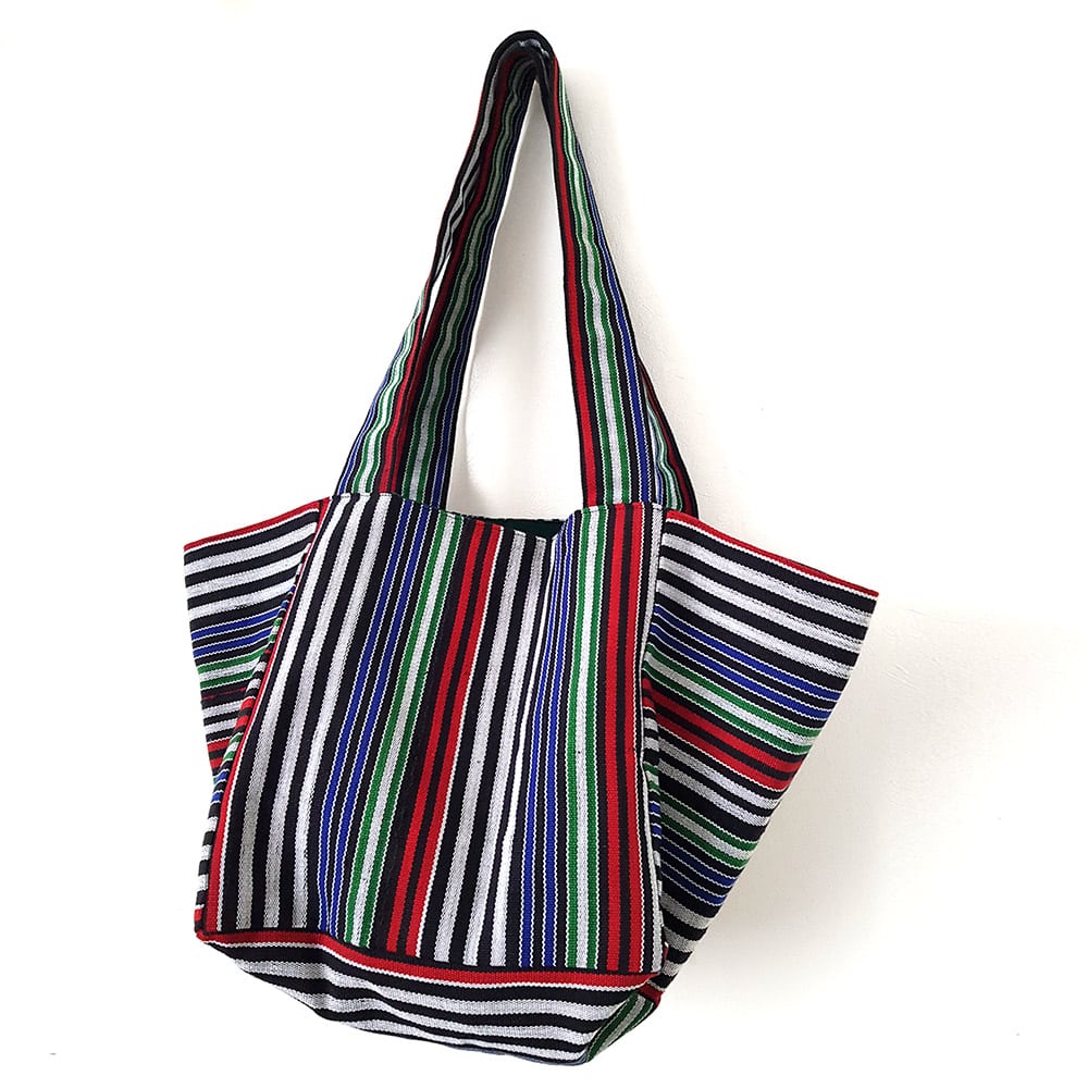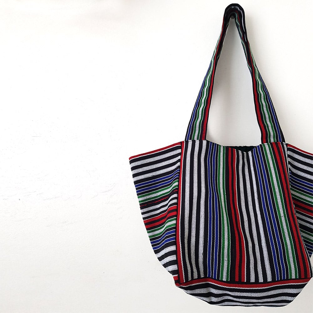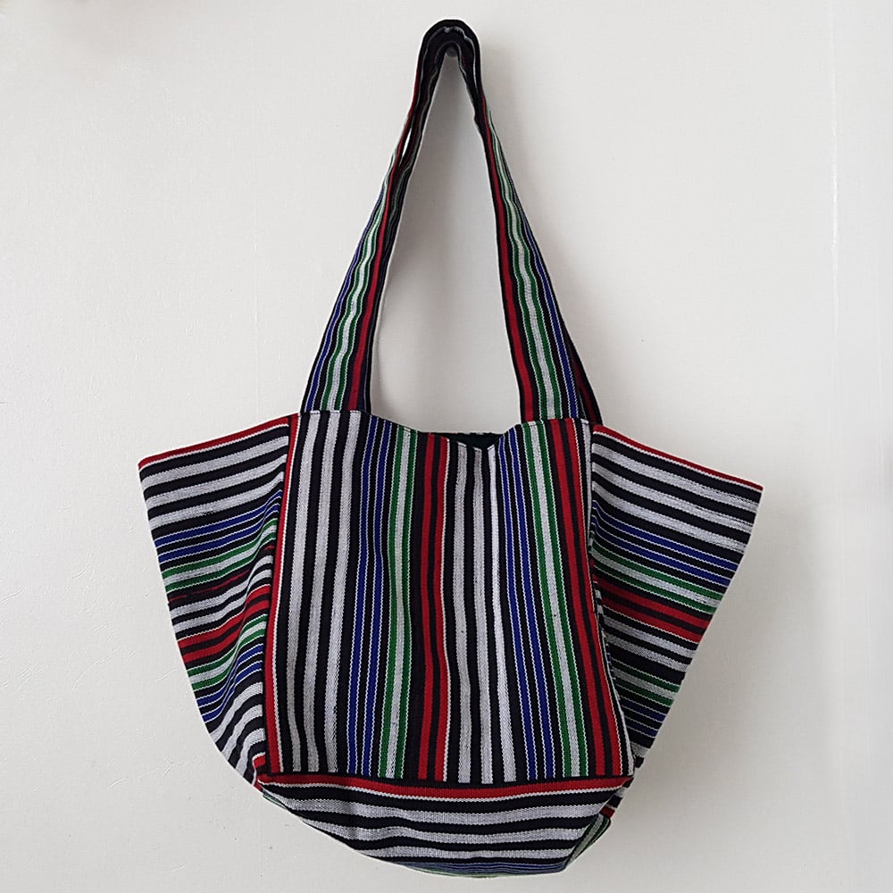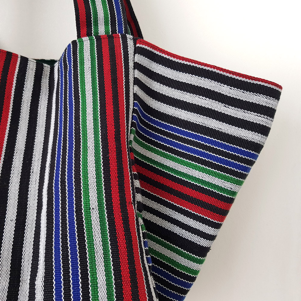 The cube tote bag consists of squares that come together to make an interesting shaped bag. This tote bag is made using ‘Aso-oke’ which is a loom-woven textile from Nigeria in West Africa. It is hand woven and the finished strips are usually sewn together to make clothing. The textile is worn during special occasions like weddings, festivals, coronations and so on.