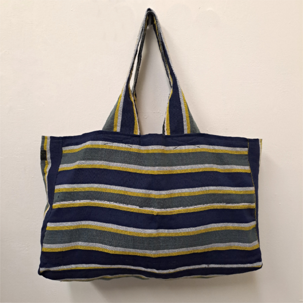 This extra large shopper bag is made using ‘Aso-oke’ which is a loom-woven textile from Nigeria in West Africa. It is hand woven and the finished strips are usually sewn together to make clothing. The textile is worn during special occasions like weddings, festivals, coronations and so on making it just the perfect material to use!