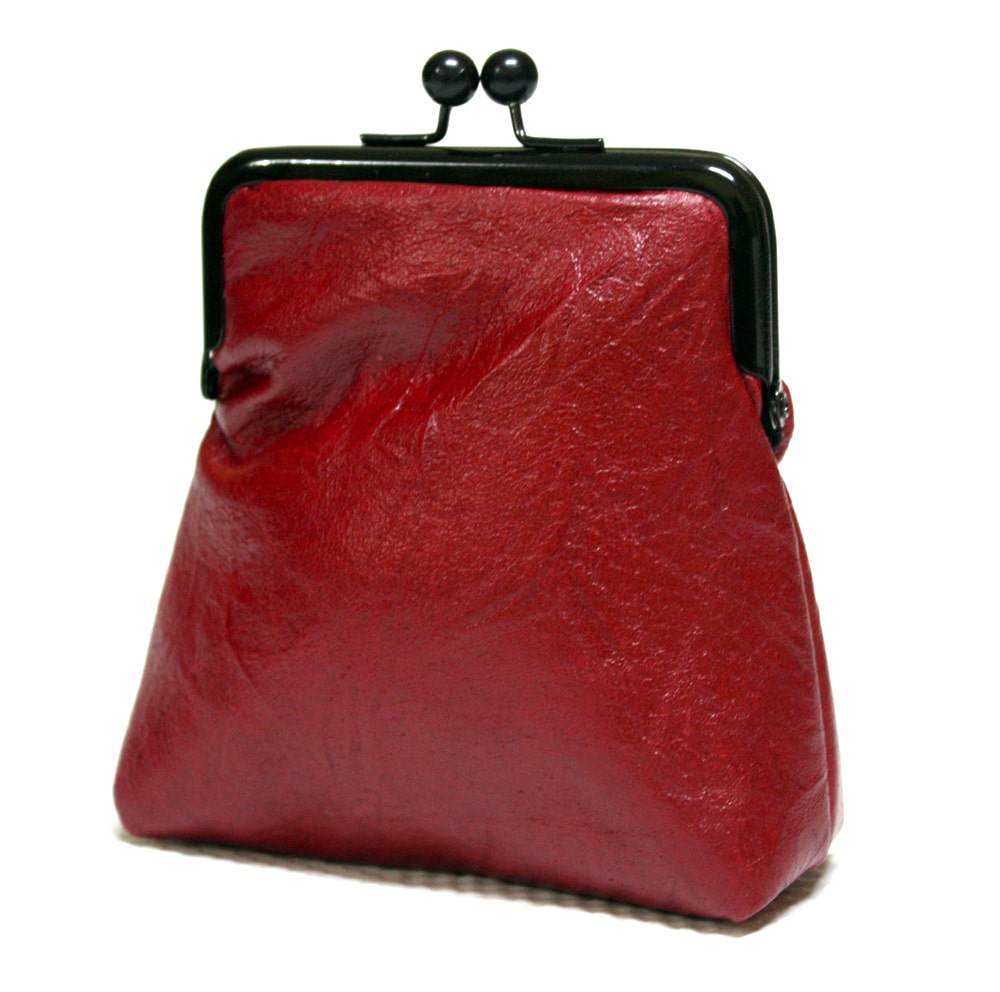 It is made in a deep red leather and lined in internally with a black cotton fabric.