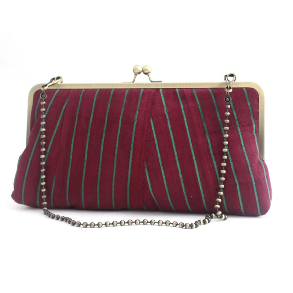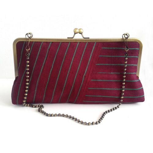 This large statement clutch purse is made out of a Nigerian fabric known as ‘Aso-oke’ which is a loom woven textile similar in texture and weight to denim or canvas. This version is an old-school vintage woven in hand-spun cotton. ‘Alaari’ refers to a reddish version of Aso-oke which is a rare find as the techniques and materials used for production are now uncommon.