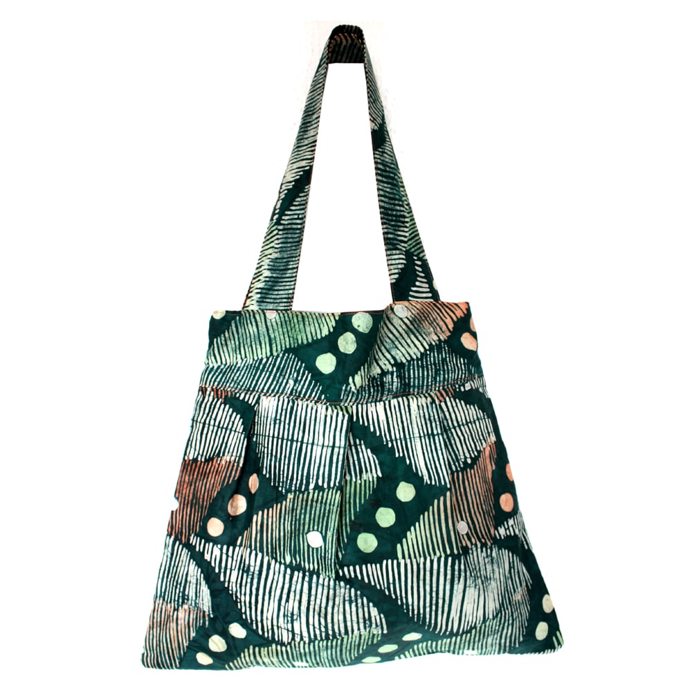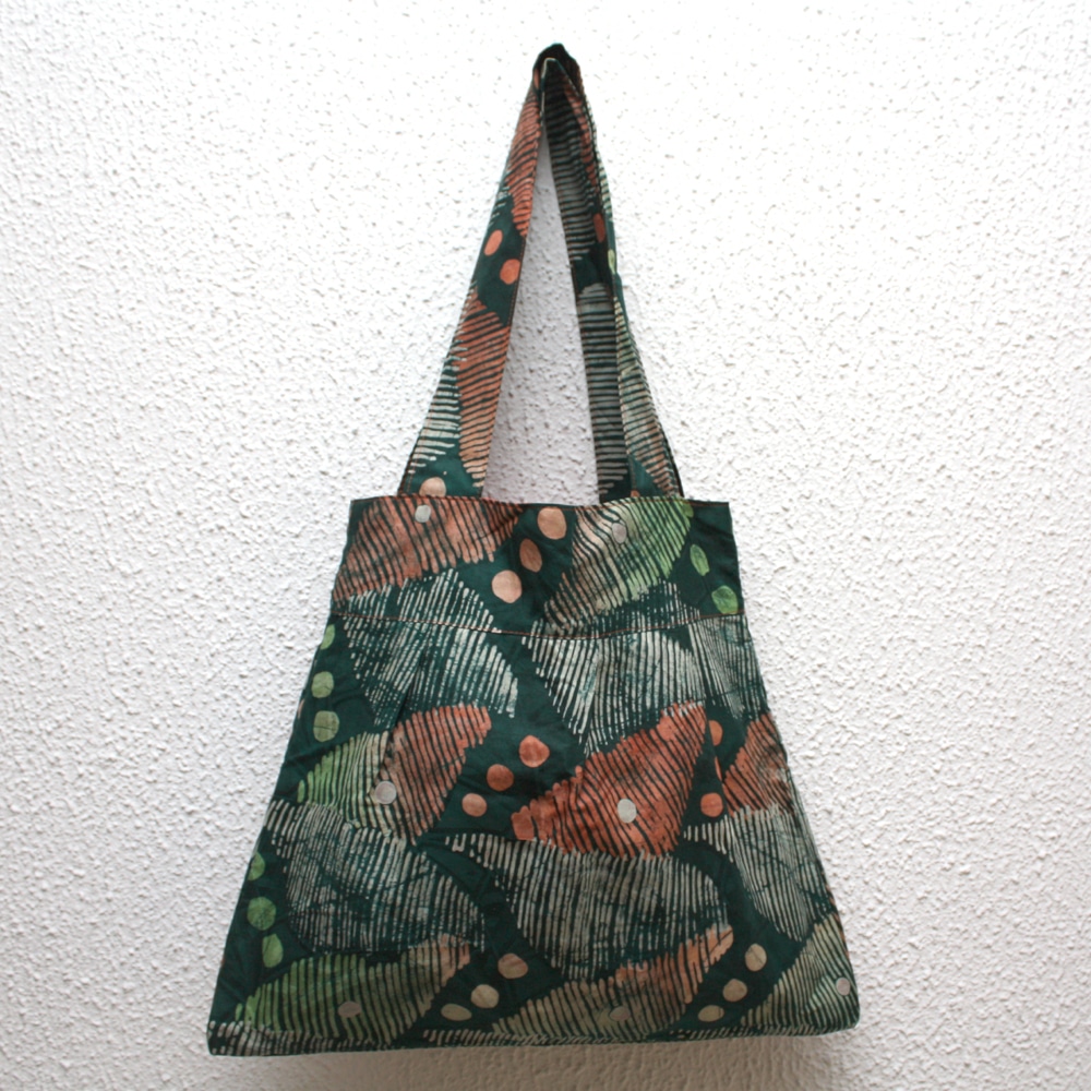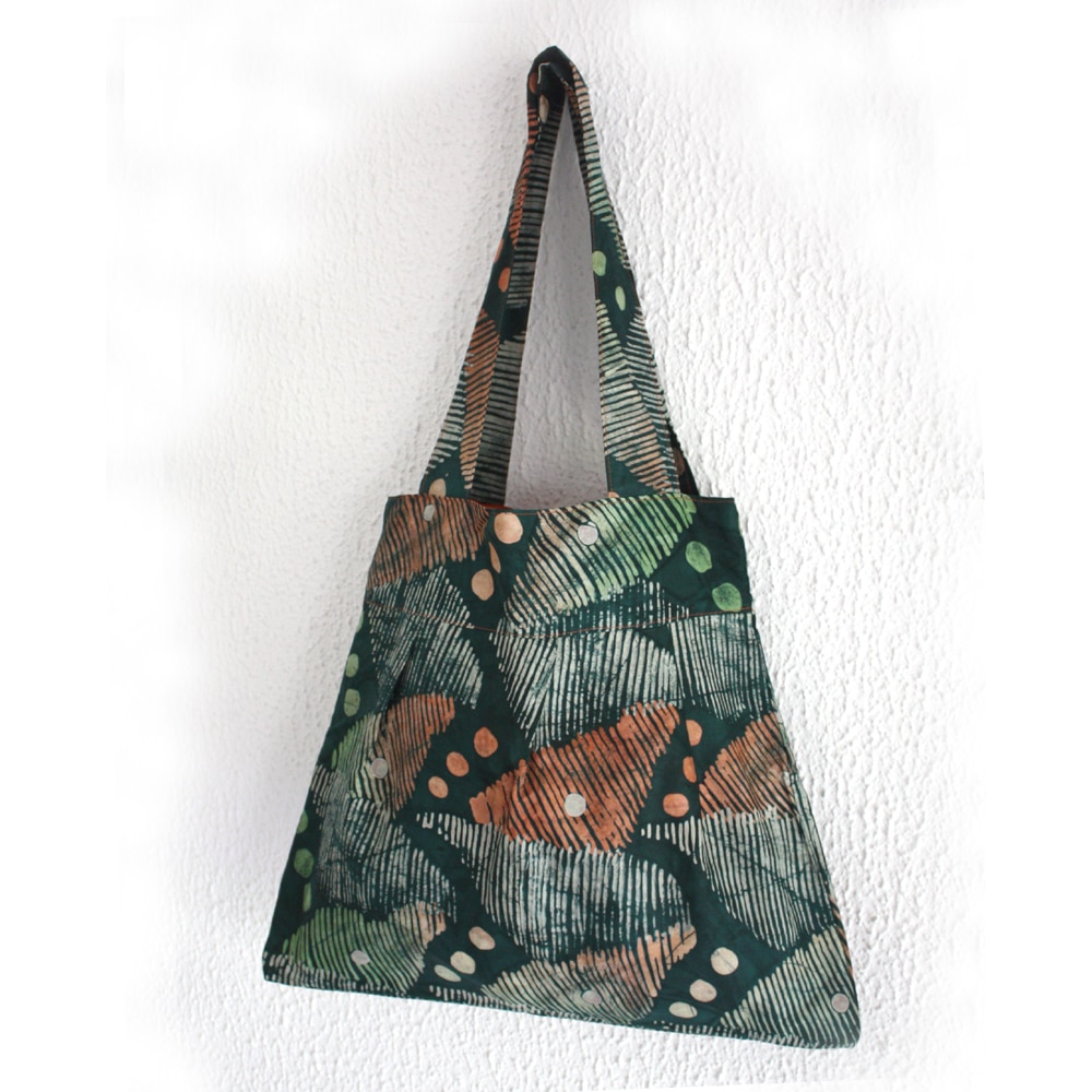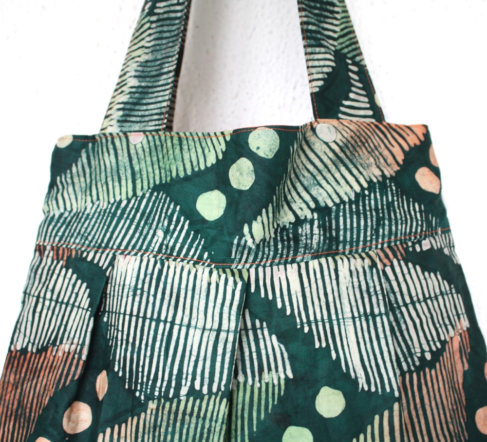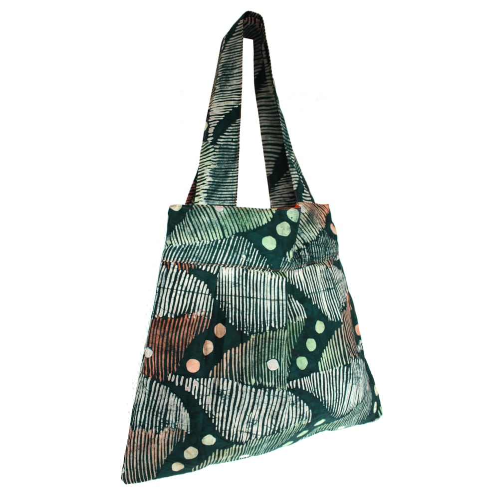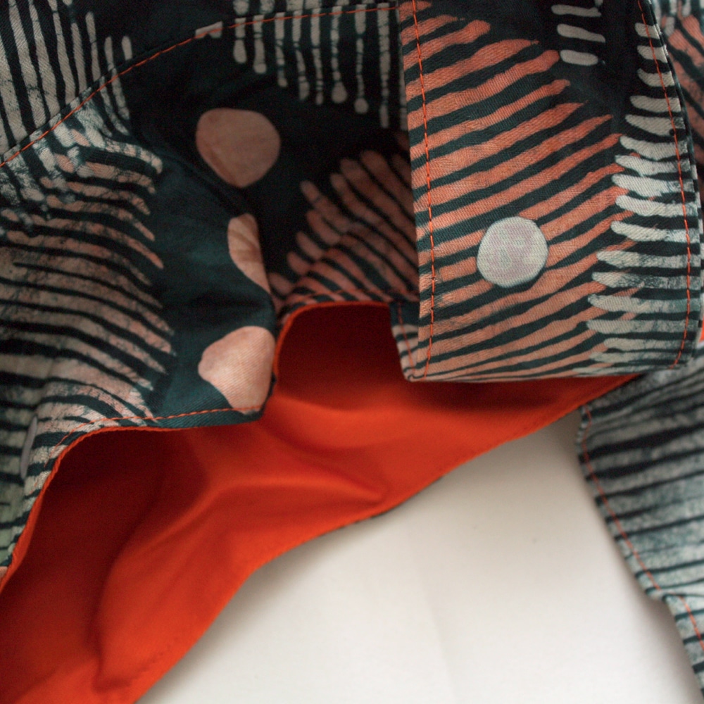 The straps make it a comfortable shoulder tote. The fabric I have used is a traditional batik fabric from Nigeria known as ‘Adire’ and the inside is lined with bright orange cotton fabric.