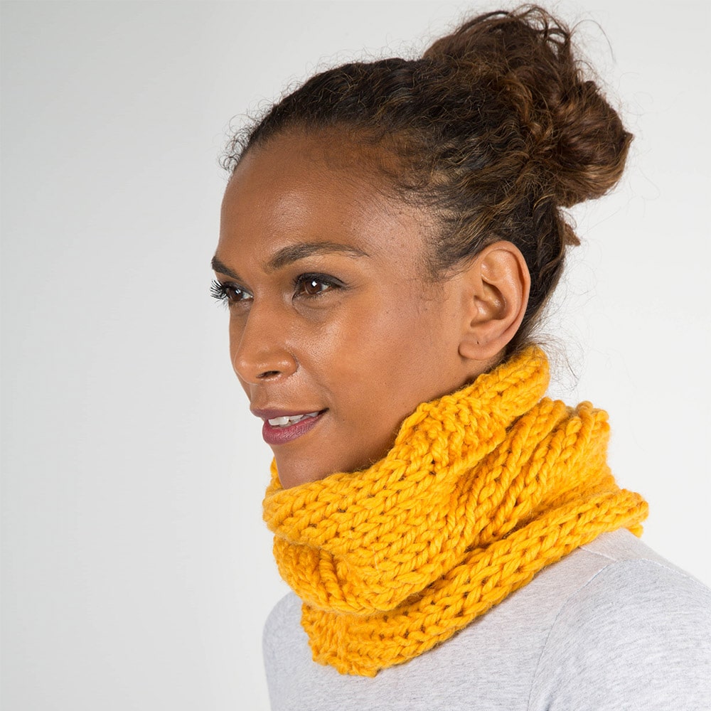This soft yellow chunky knit wool snood is one cool accessory for the cold winter weather. It simply slips over the head to keep the neck warm.  It is stretchy so it is worn very easily. It makes a great alternative to a long scarf and it sits easily above your coat/jacket or under it.